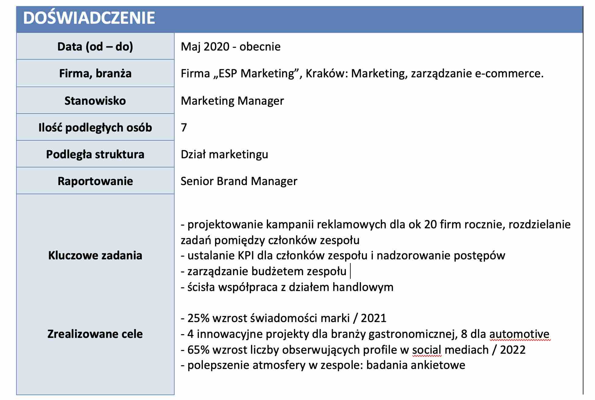 - Z naszego doświadczenia wynika, że Polskie życiorysy w odróżnieniu od tych tworzonych w UE i USA są bardzo ubogie w zakresie opisu osiąganych efektów. Bardzo rzadko w Polsce spotykamy się z danymi odnośnie osiągniętych wzrostów sprzedaży, wartości kluczowych projektów, ilości pozyskanego nowego biznesu, itp.